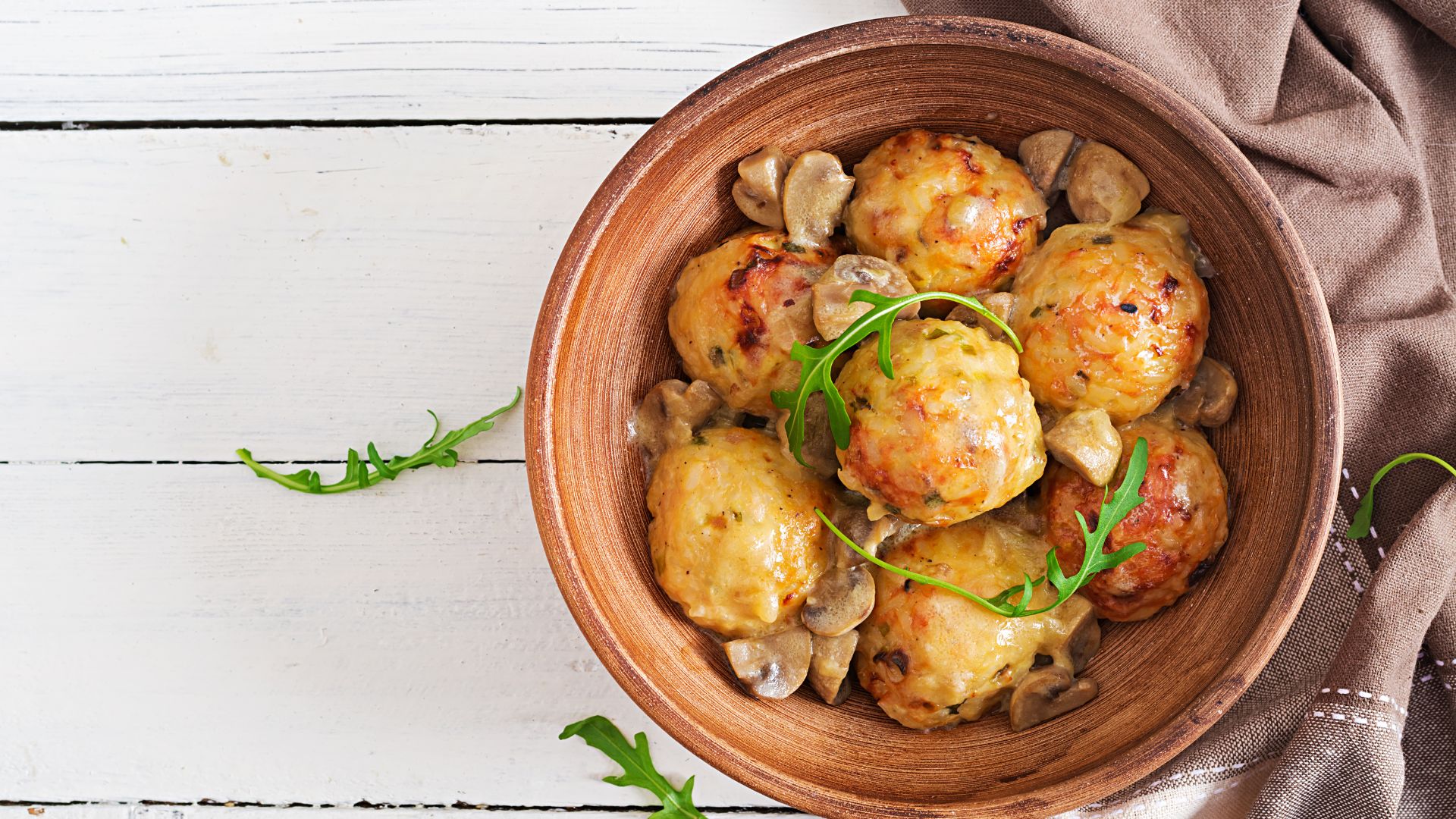 - ingredienti: funghi Champignon, carne macinata, pangrattato, uovo, parmigiano, cipolle, carote, sedano, vino bianco, passata di pomodoro, brodo vegetale, olio extravergine d'oliva, sale, pepe;