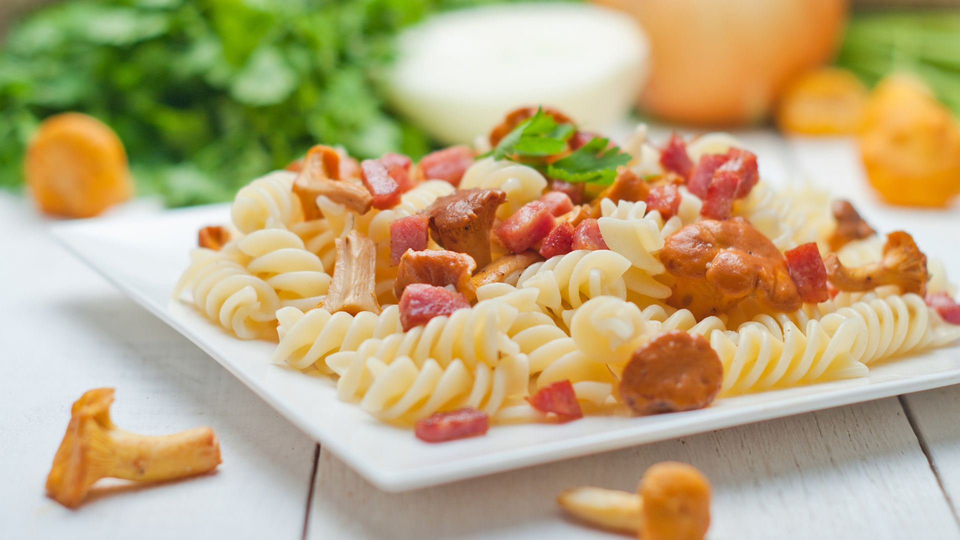 Pasta con funghi Champignon e pancetta