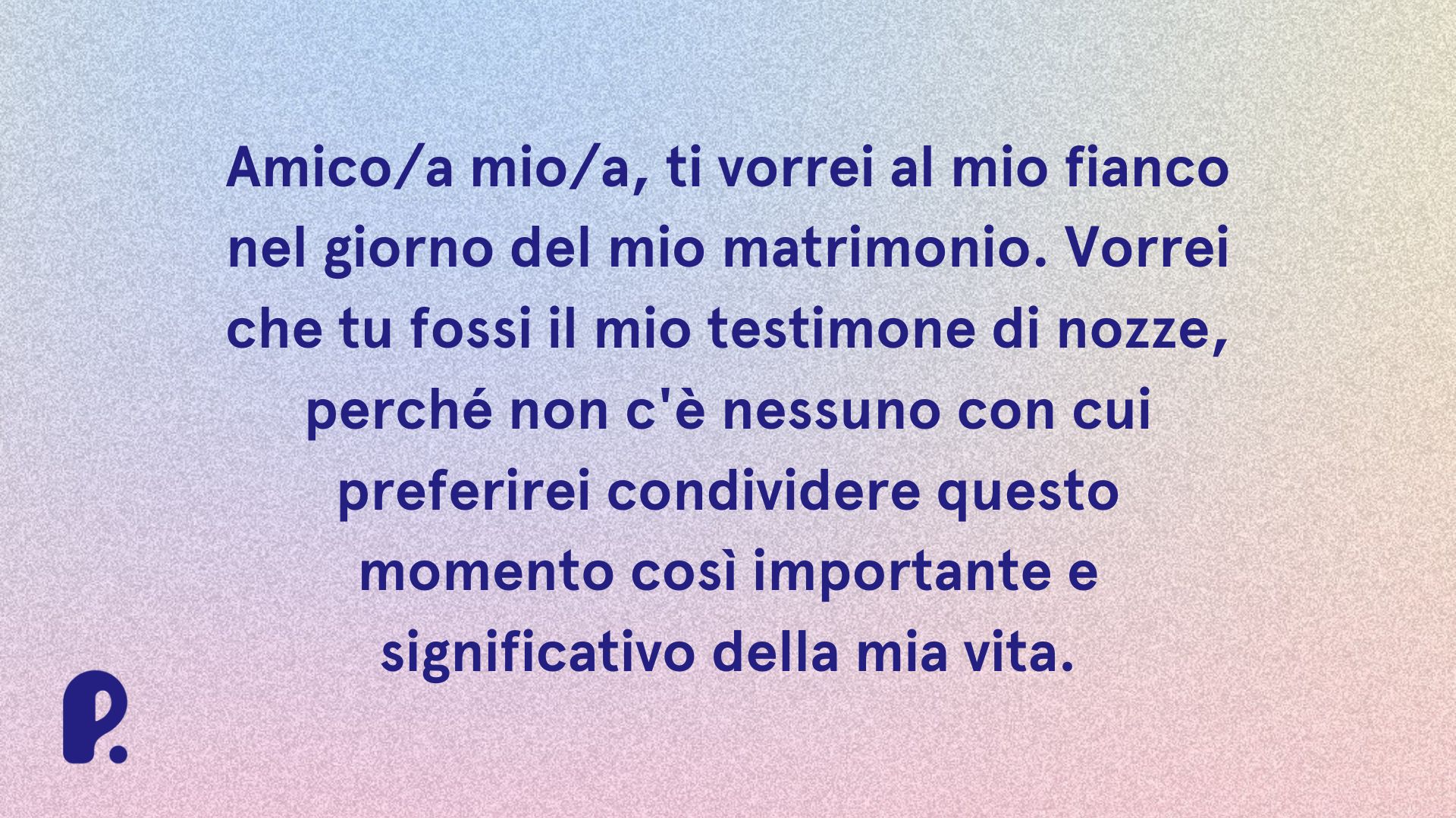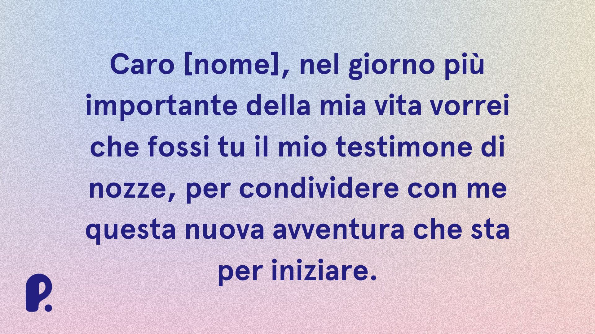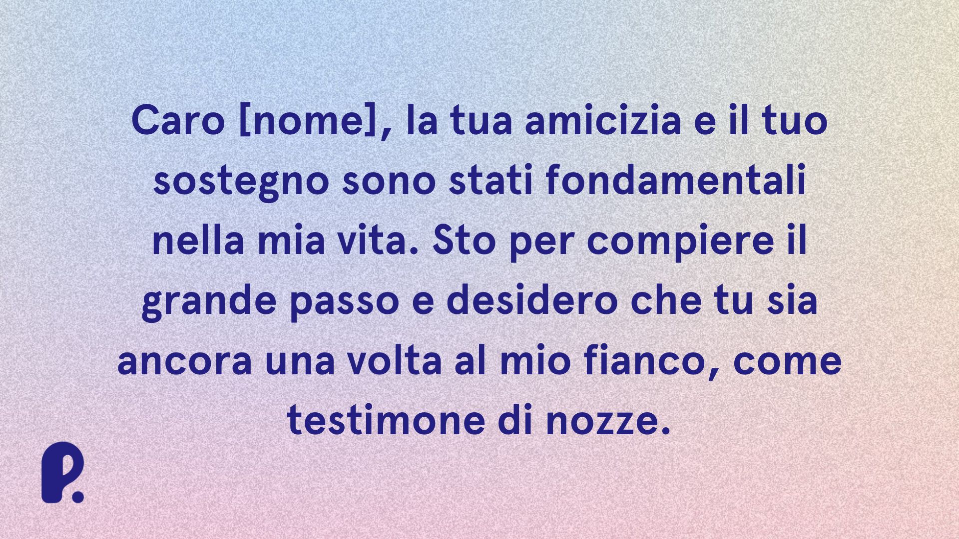- “Caro [nome], ti ringrazio davvero tantissimo. La tua vicinanza nel giorno del nostro matrimonio ci ha gratificati molto. Subito abbiamo pensato a te per affidarti il ruolo da testimone di nozze. Grazie per aver accettato”.