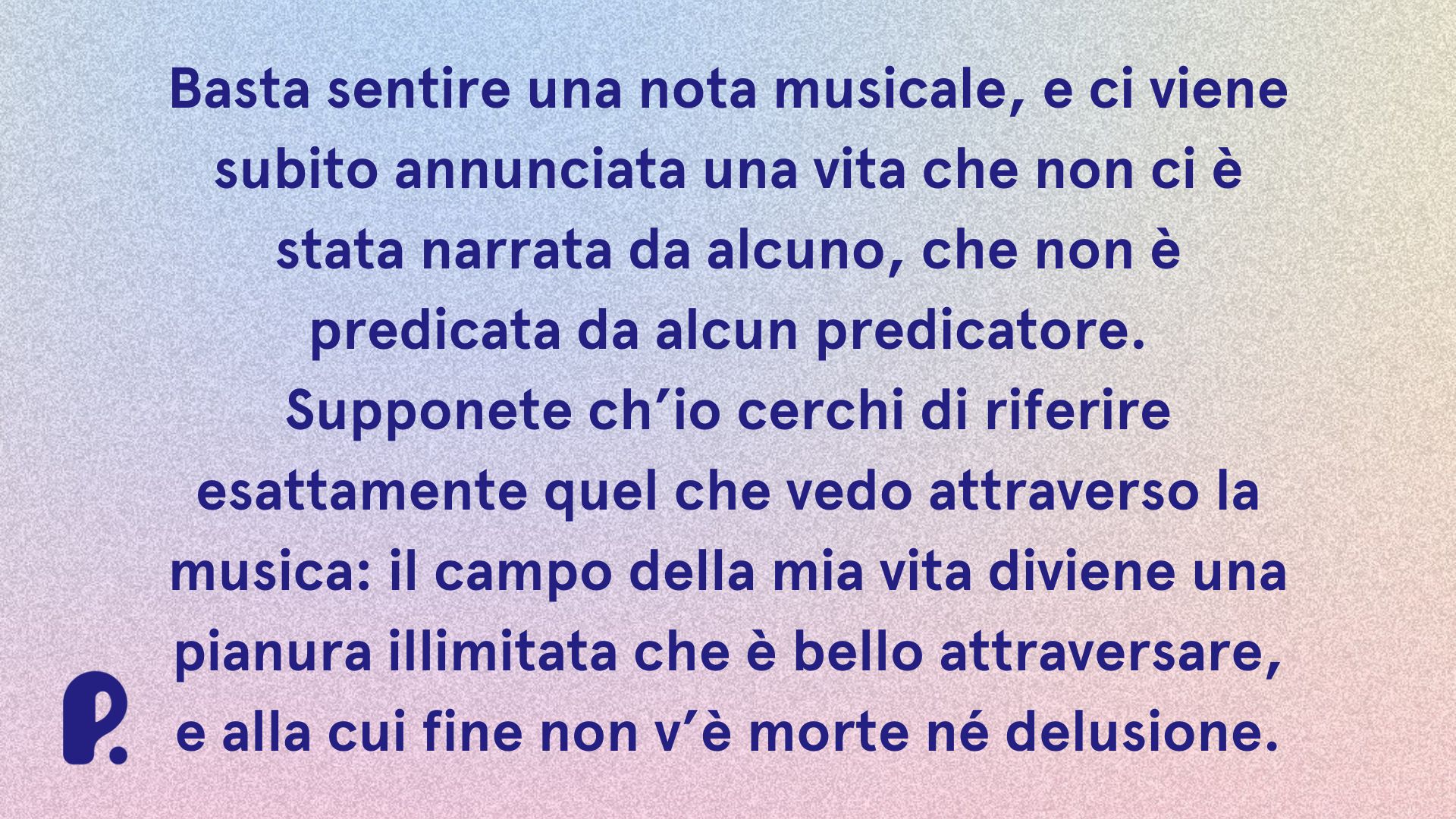 - La musica è un fluido in divenire, un linguaggio evanescente; ascoltandola entriamo in un’altra vita e in un altro tempo.