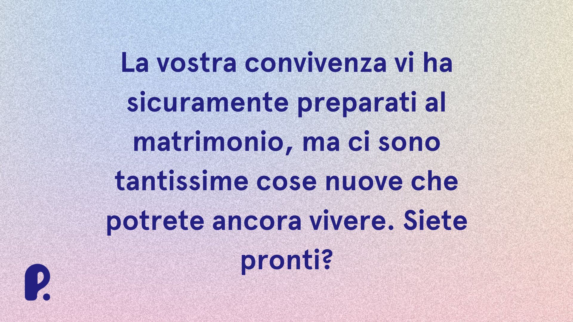 - Tanti auguri a voi che avere deciso di compiere questo passo così importante dopo la convivenza, più consapevoli, più maturi ma anche aperti alle sorprese del matrimonio. Buona vita!