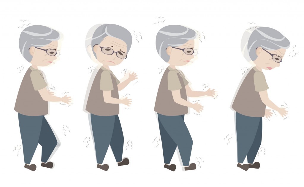 Il sintomo iniziale più riconoscibile del morbo di Parkinson è il tremolio degli arti. Inizialmente, può interessare anche un solo dito delle mani (il pollice) oppure essere di breve durata e casuale. Spesso, i tremolii sono associati alla tendenza ad assumere una posizione eretta accentuatamente incurvata.